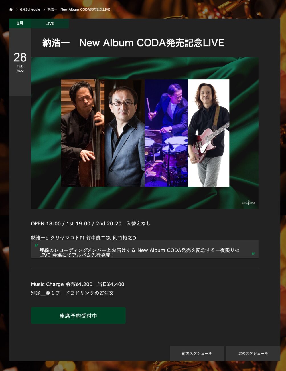 それにさきがけ、来週6月28日には六本木サテンドールで、CD先行発売記念ライブ、「納浩一ブレイズ琴線」を開催します。