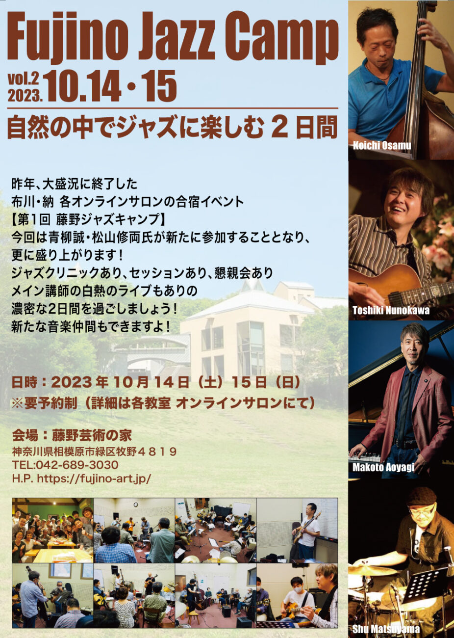 今月はなんと言っても、14,15日で開催する「第2回藤野ジャズキャンプ」です。