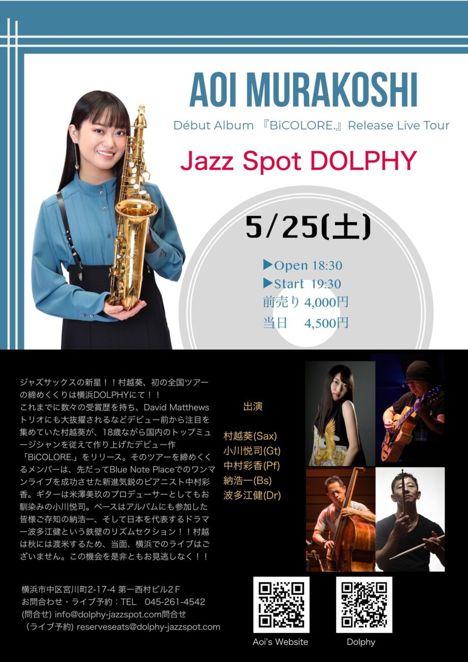 その翌日25日の横浜ドルフィーでは、この4月に驚愕のデビューアルバムを出した若干18歳のサックス奏者、村越葵さんのCD発売記念ライブに参加します。