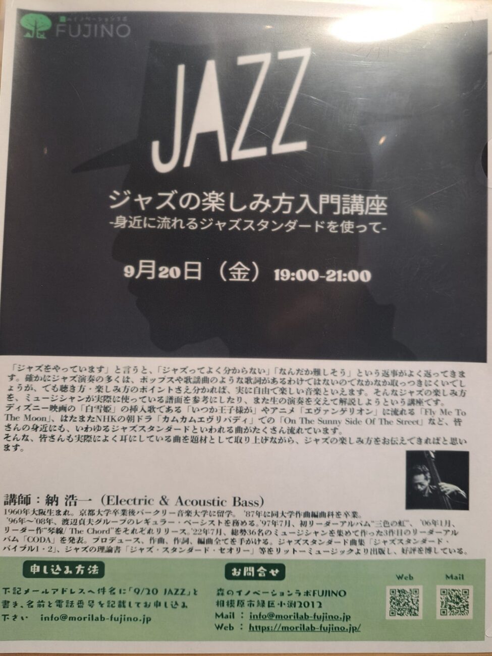 来週9月20日、僕の住む神奈川県相模原市緑区の藤野駅前にある「森のイノベーションラボFUJINO」で、「ジャズの楽しみ方入門」という講座を行います。